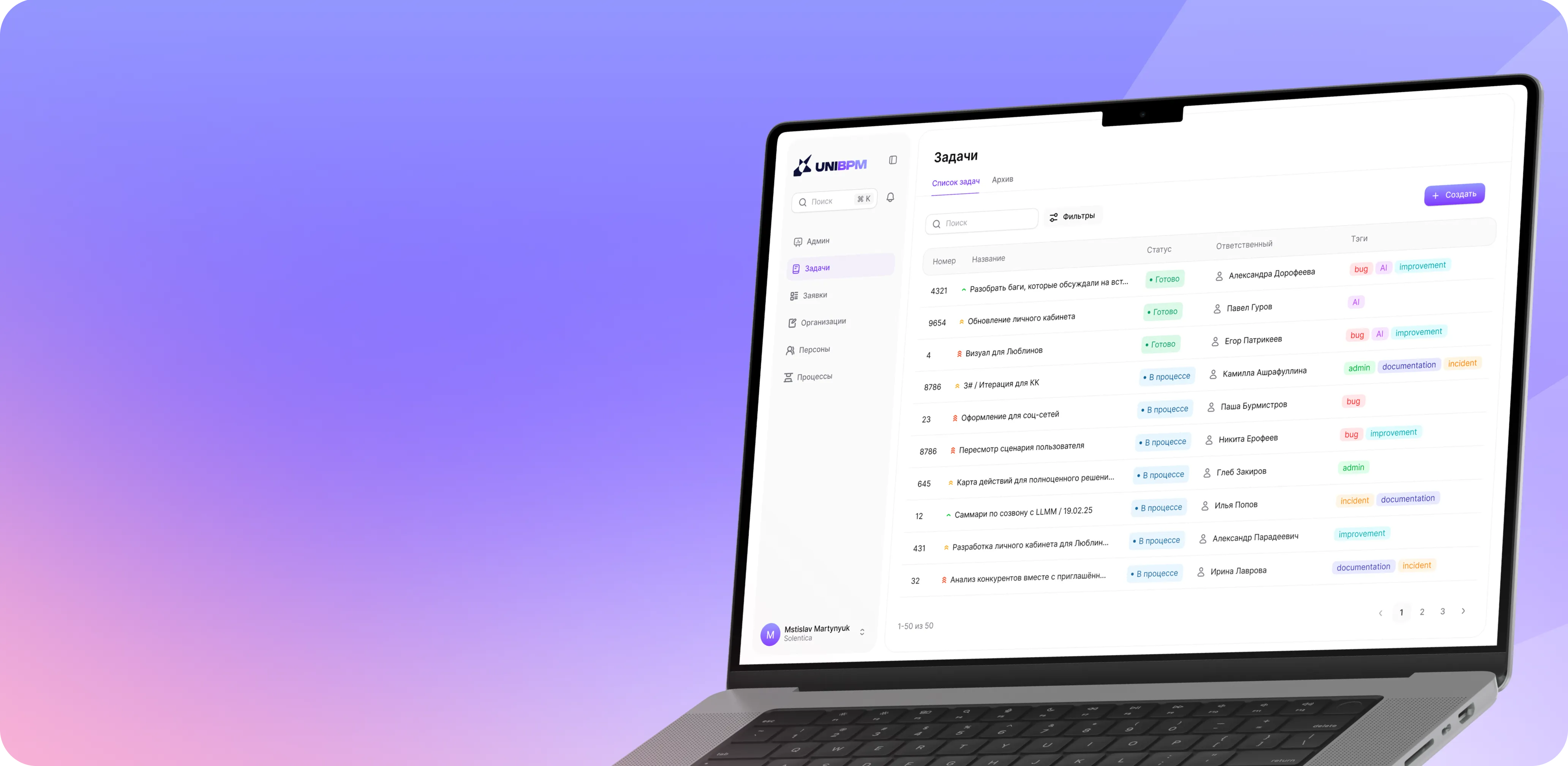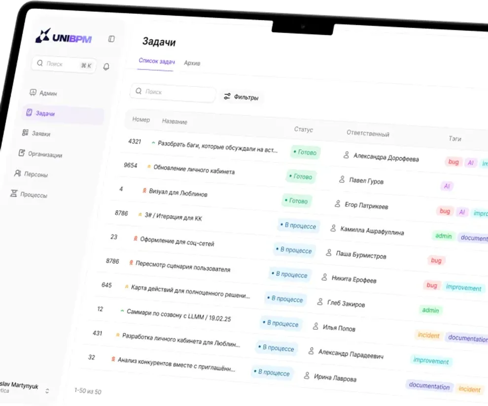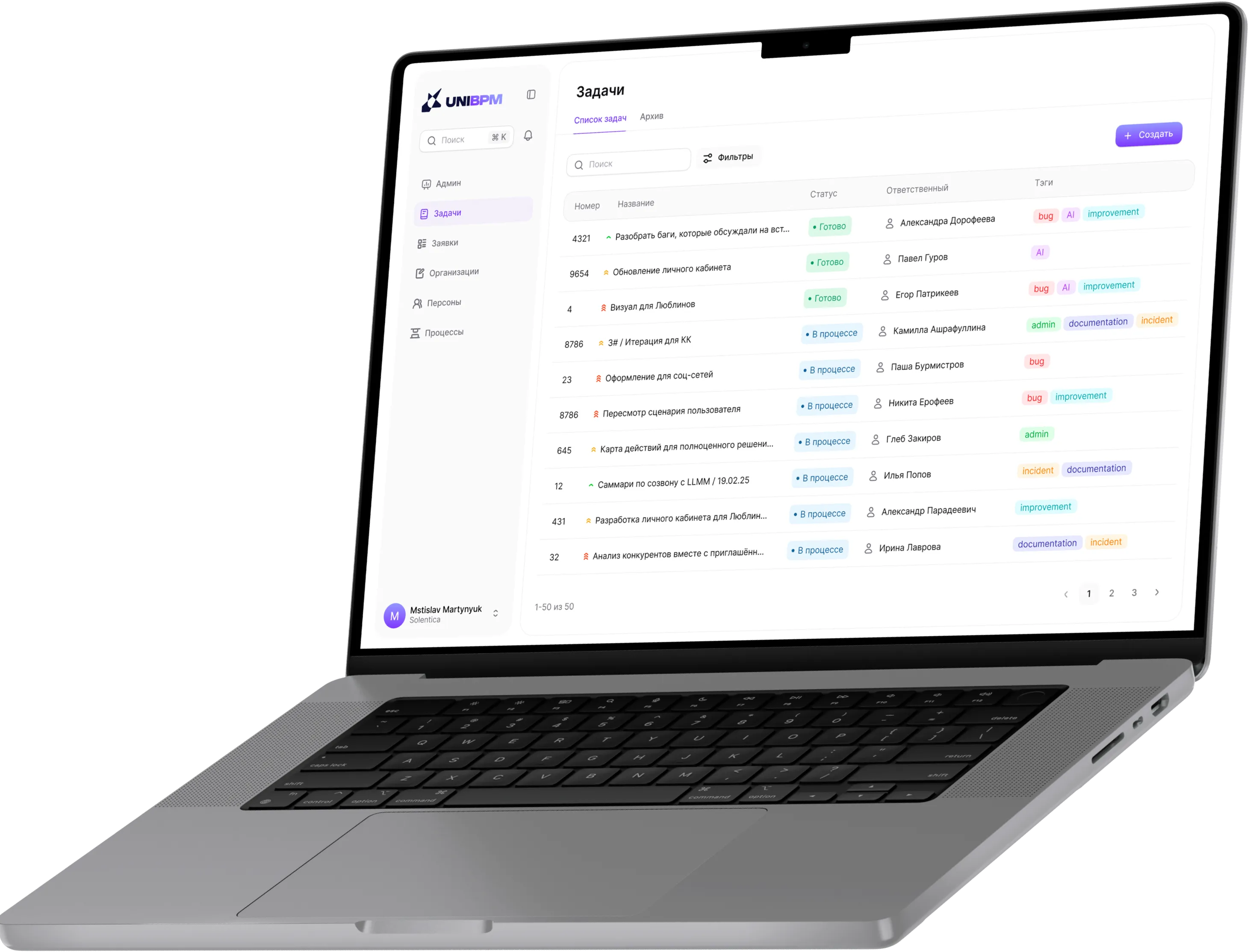 запускайте процессы прямо из интерфейса или через API. UniBPM автоматически создаёт задачи, уведомления и маршрутизирует действия по заданной модели процесса.